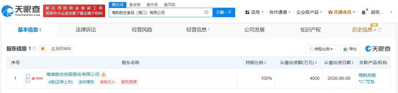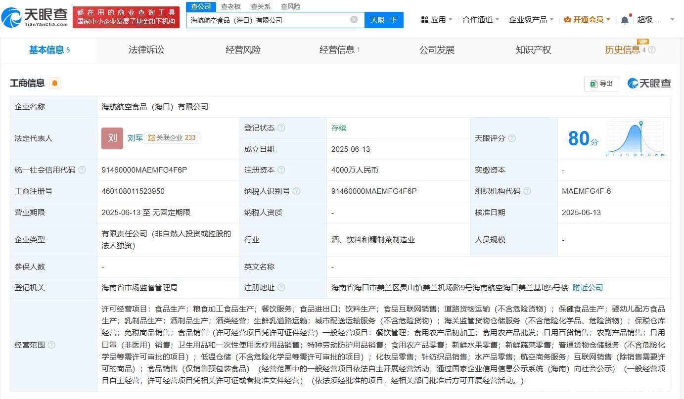 天眼查App显示,近日,海航航空食品(海口)有限公司成立,法定代表人为刘军,注册资本4000万人民币,经营范围包括食品生产、餐饮服务、食品进出口、饮料生产、食品互联网销售等。股东信息显示,该公司由海航控股(600221)全资持股。